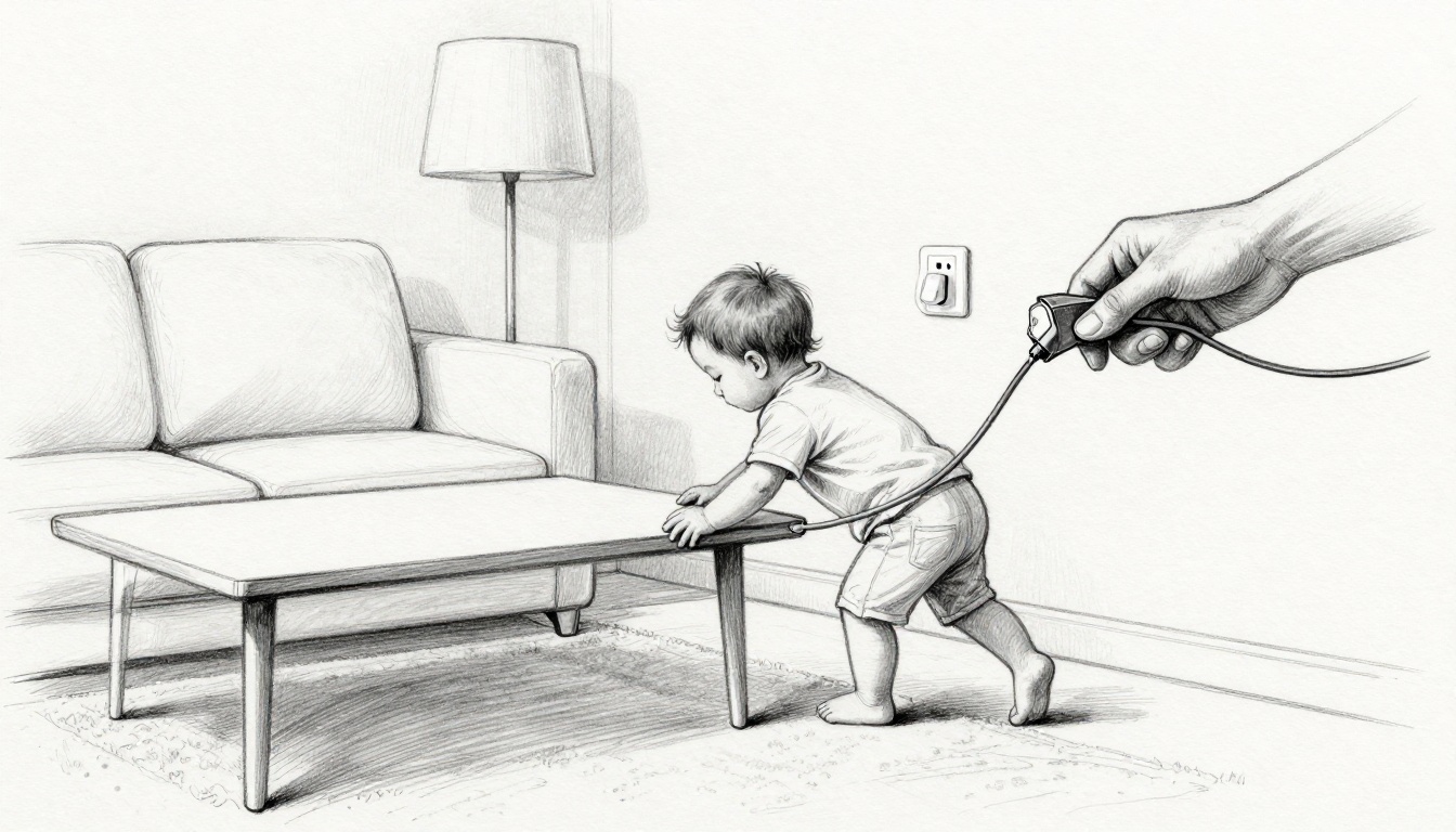 Picture your toddler spotting a charger cord dangling from the coffee table. They grab it fast. One tug, and the lamp crashes down.